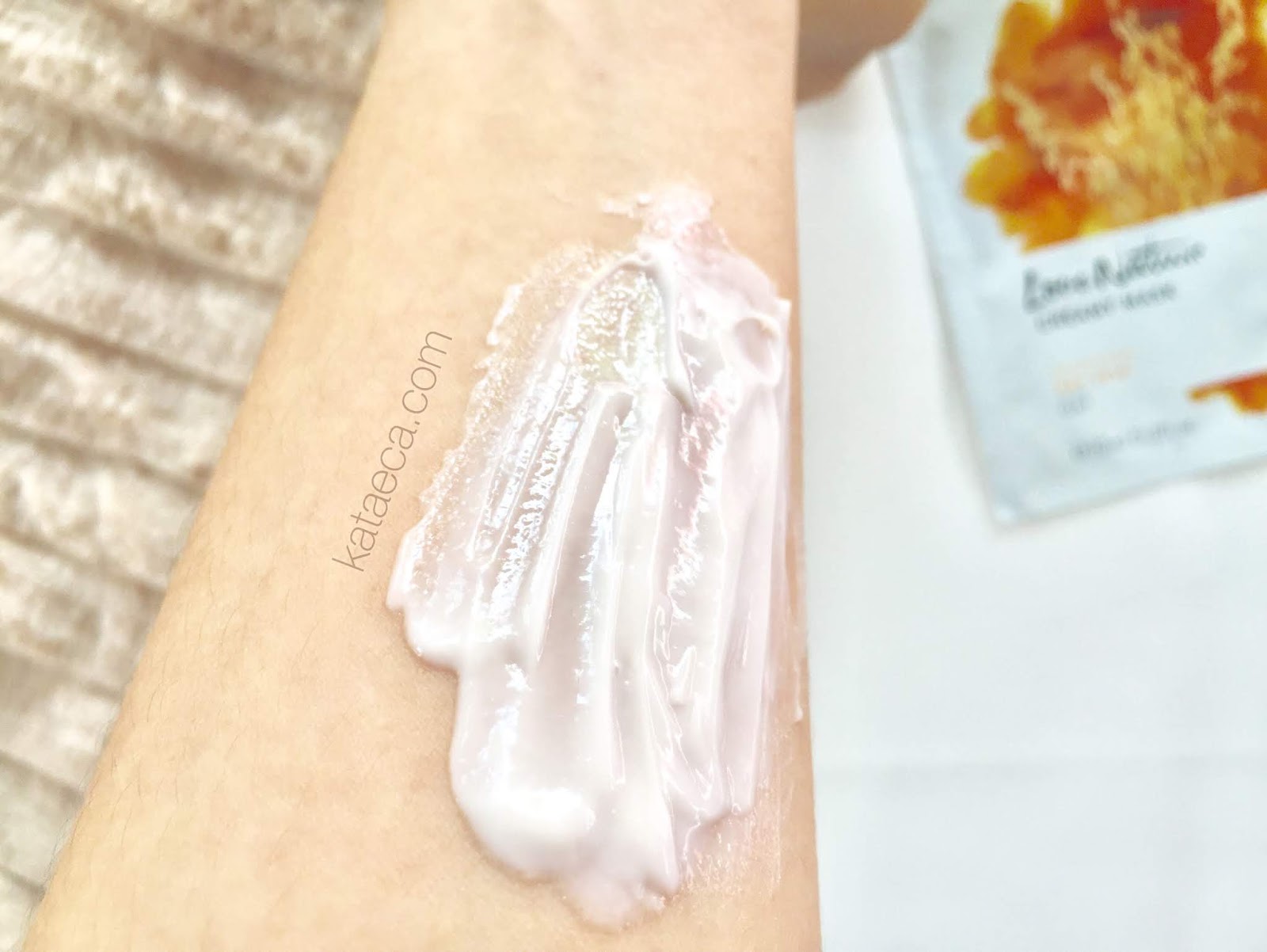 Pertama kali memakai creamy mask ini, aku langsung ngerasa yakin bahwa ini bisa benar-benar melembapkan. Why? Karena pas diolesin itu kulitku langsung merasakan sensasi creamy-nya itu. Semacam mentega gitu (tapi nggak gitu banget juga). Et, tapi dia sama sekali nggak lengket lo.