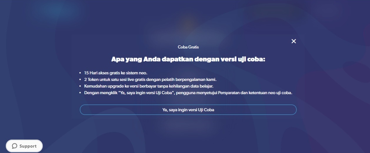 Setelah proses verifikasi selesai dan kamu dinyatakan mempunyai akun, kamu akan mendapati sebuah tombol Try Before You Buy. Ini merupakan fitur terbaru dari Neo yang memungkinkanmu untuk mendapatkan fasilitas 15 hari akses, 2 token untuk sesi live bersama coach dan kamu bisa upgrade ke kursus berbayar tanpa kehilangan track belajarmu.