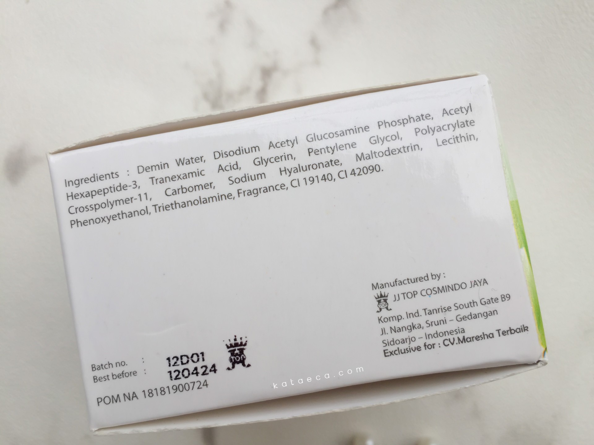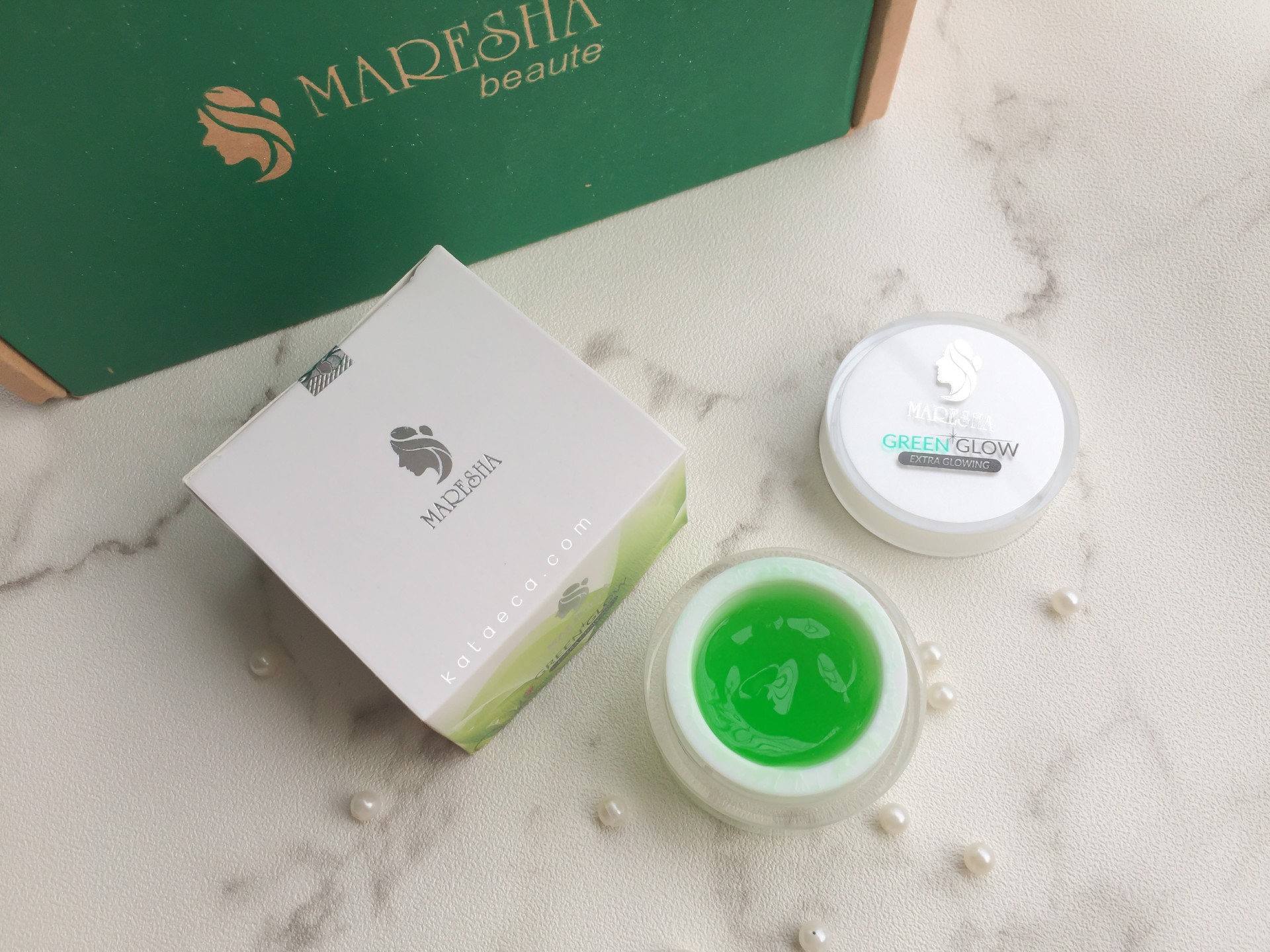 Dilengkapi juga dengan kemasan dus kertas dengan nuansa warna green and white. Ada segel hologram juga di atasnya. Pada saat pengiriman produk, dilengkapi dengan kardus besar bertuliskan Maresha Beaute di atasnya.