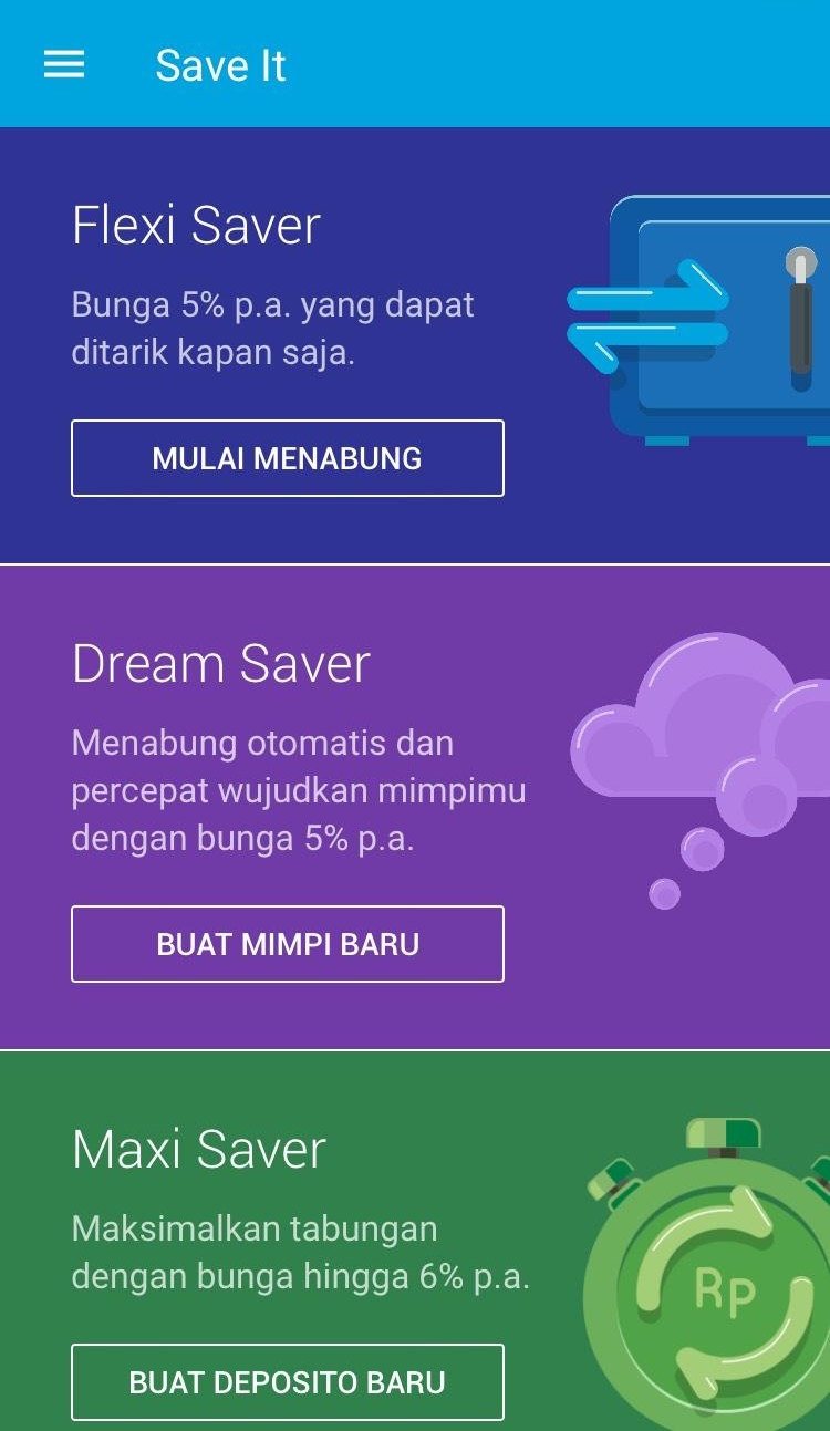 Enggak sampai di situ saja. Masih ada fitur lainnya. Salah satu yang paling dibutuhkan untuk budgeting adalah fitur Save It. Fitur ini memungkinkan kamu untuk menyimpan uang untuk kebutuhan yang lebih spesifik.