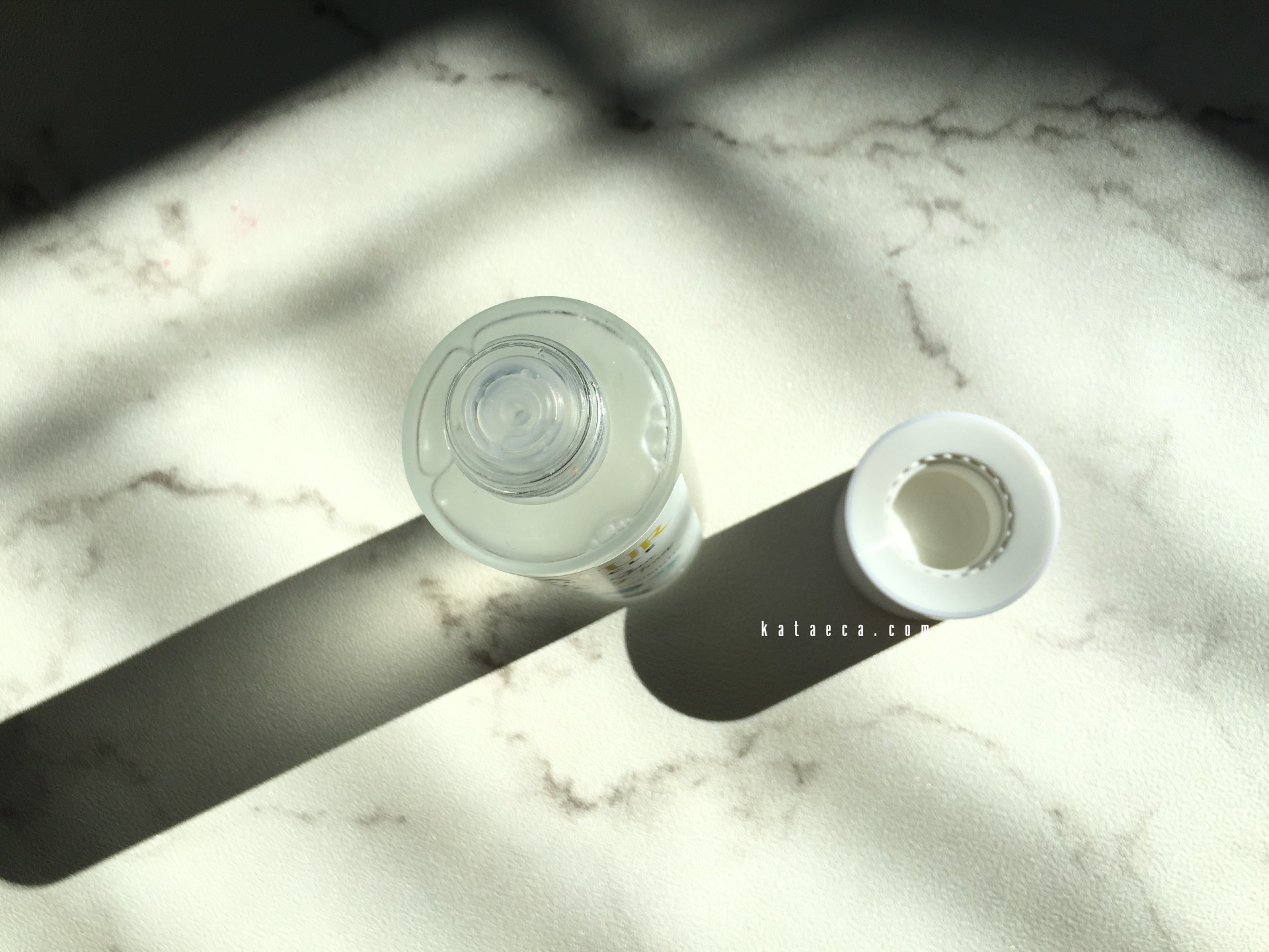 Produk toner ini memiliki packaging dengan netto 100 ml dengan botol kaca tebal yang super kokoh. Tutupnya double protection. Jadi setelah penutup utama, ada 1 penutup lagi yang membuat cairan di dalamnya nggak bakalan tumpah.