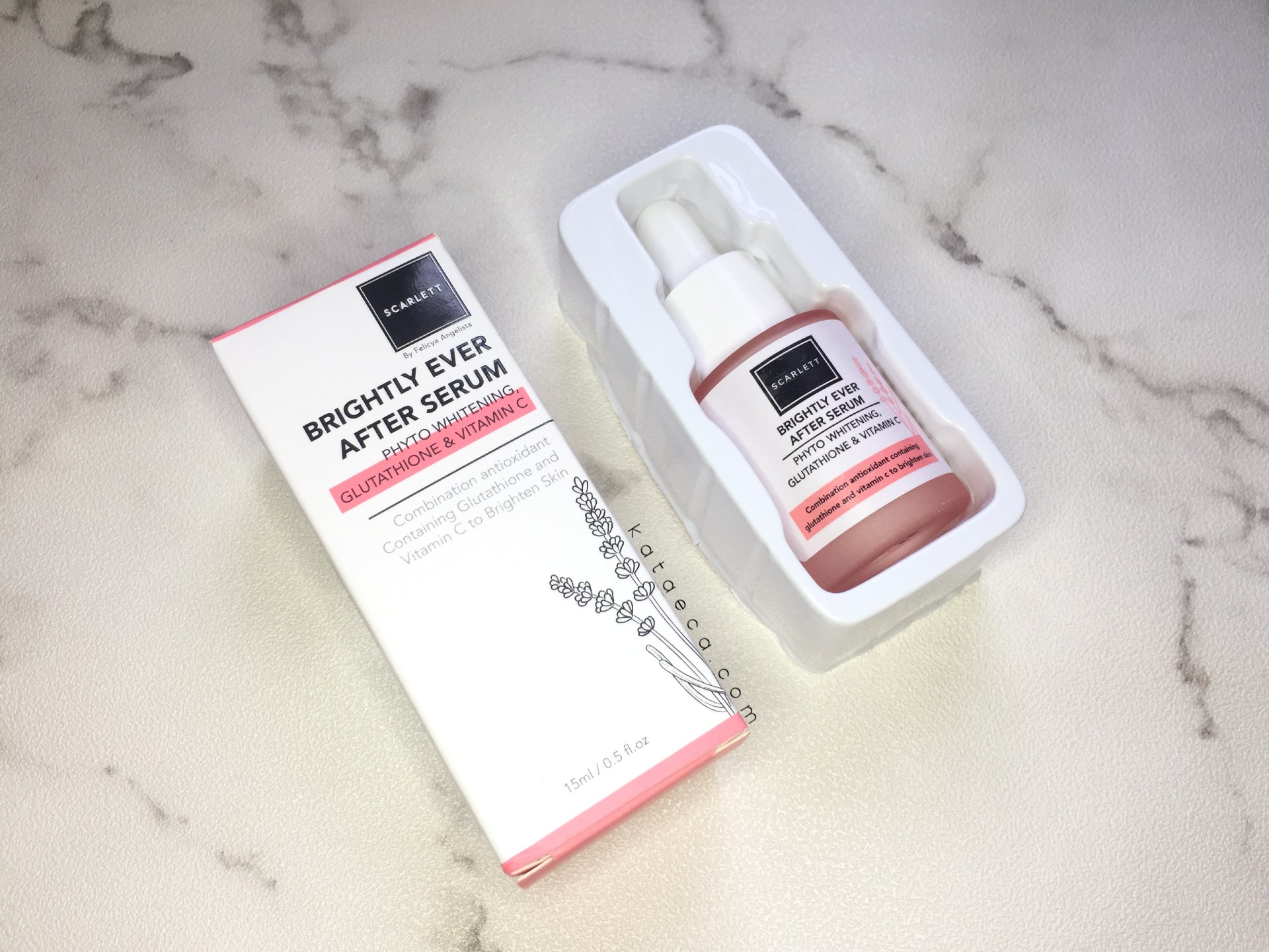 Kedua varian serum Scarlett ini punya kemasan yang sama yaitu botol kaca dengan aplikator pipet/dropper berwarna putih susu.