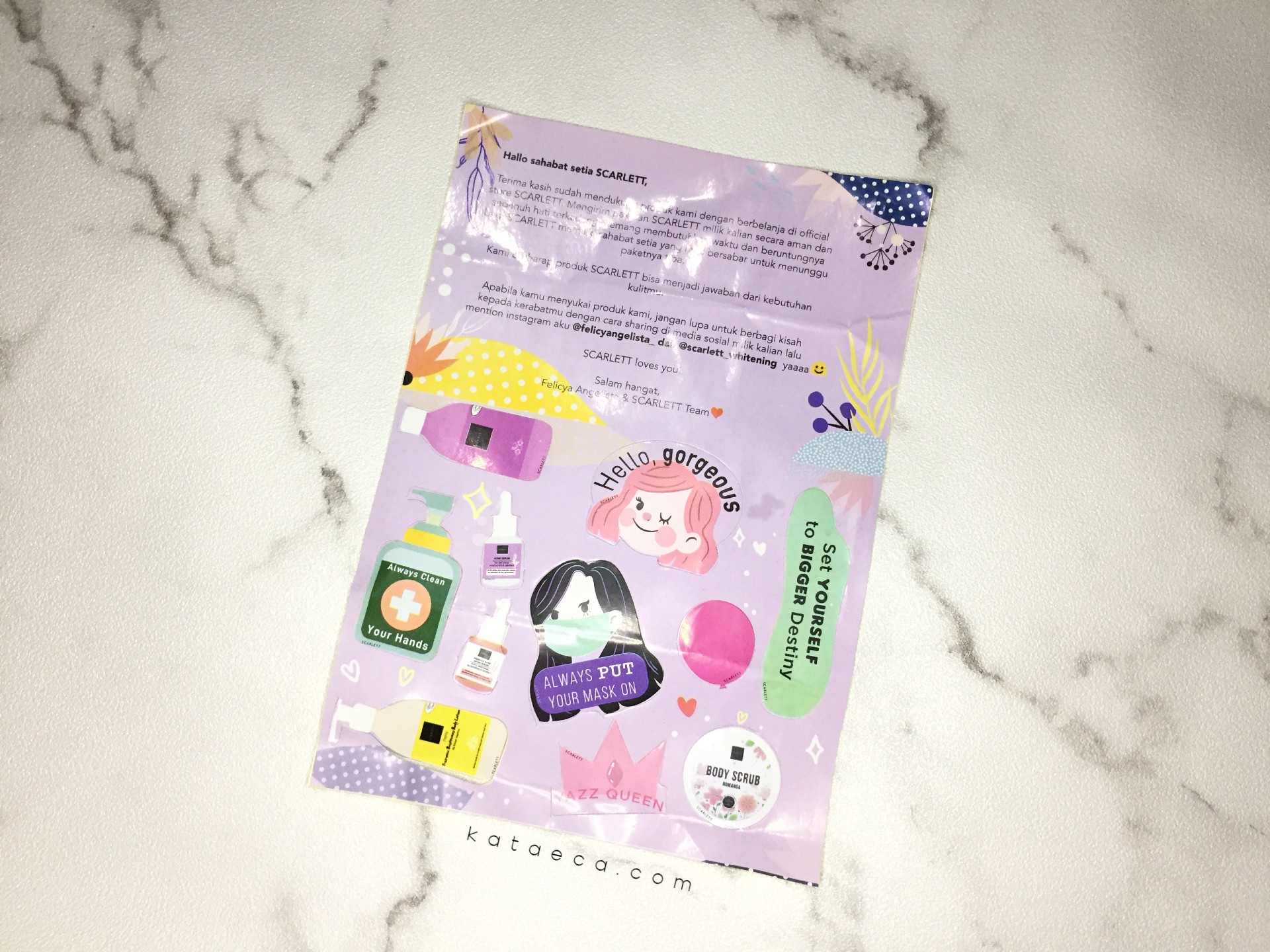 Terus packaging-nya juga super aman. Bubble wrap-nya tebal dan kardusnya official banget, bertuliskan Scarlett. Pengirimannya juga cepat.