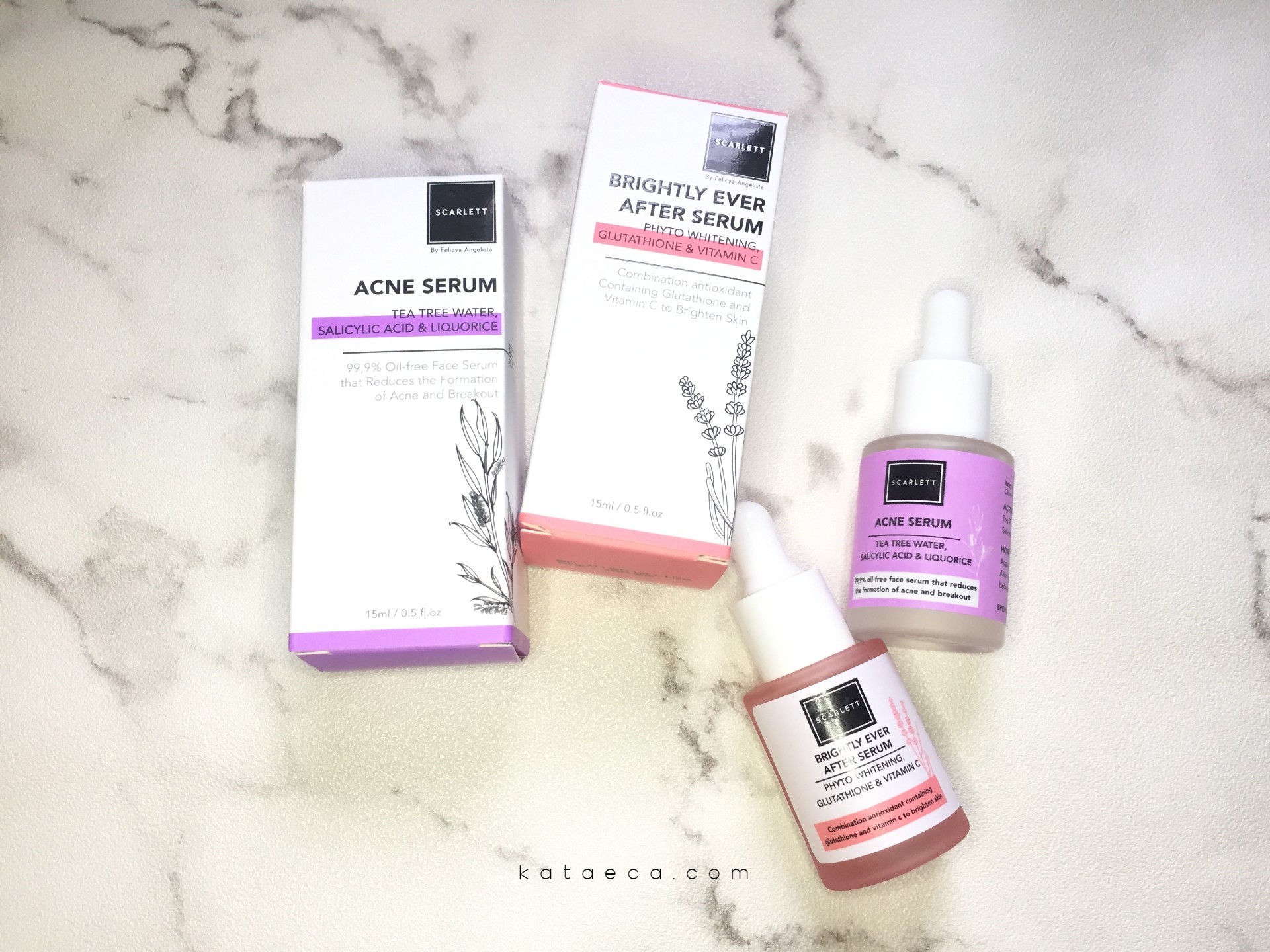Untuk yang varian brightly, botol dan kotak kertasnya dominan warna pink sedangkan yang acne serum dominan warna ungu.