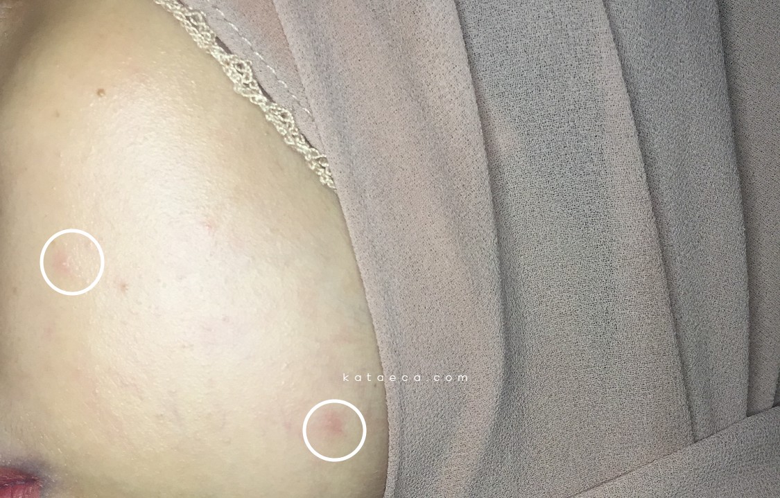 Jerawatnya cenderung kecil-kecil dan ada beberapa butir (seperti yang ada di foto). Kalau nggak aku pakaikan apa-apa, dia bakal hilang sendirinya tanpa bekas dalam waktu 3-4 harian.
