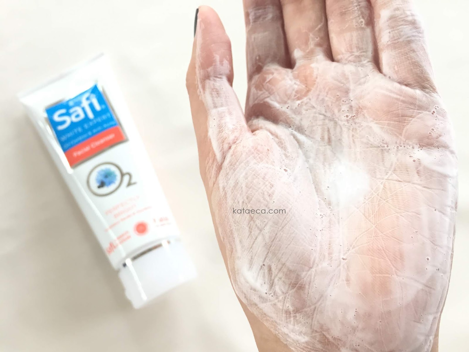 Kemasan tube dengan didominasi warna putih, biru dan orange. Membuat produk ini gampang dibedakan dengan varian lainnya dari Safi. Aku punya kemasan 100 g dan kayaknya nggak ada kemasan selain tube untuk cleanser-nya ini. Warnanya putih seperti milk dan padat. Foamy dan lembut di kulit.